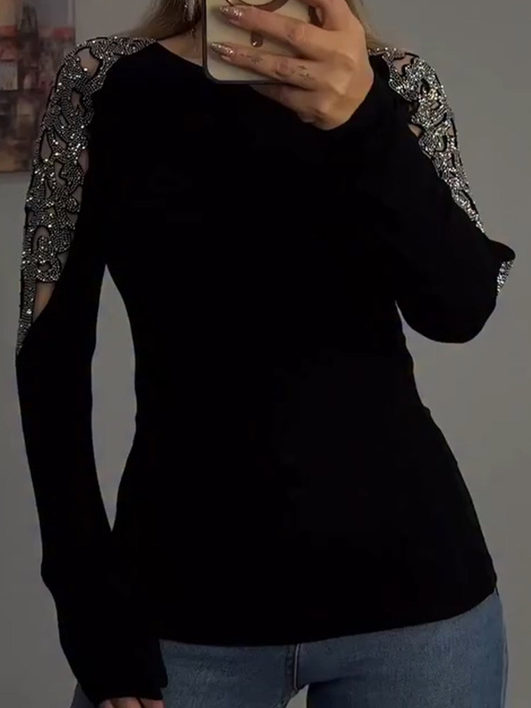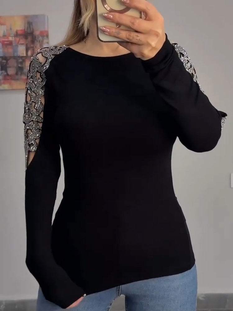 Women Round Neck Sleeves Hollowed Out Hot Stamping Rhinestone Casual Top