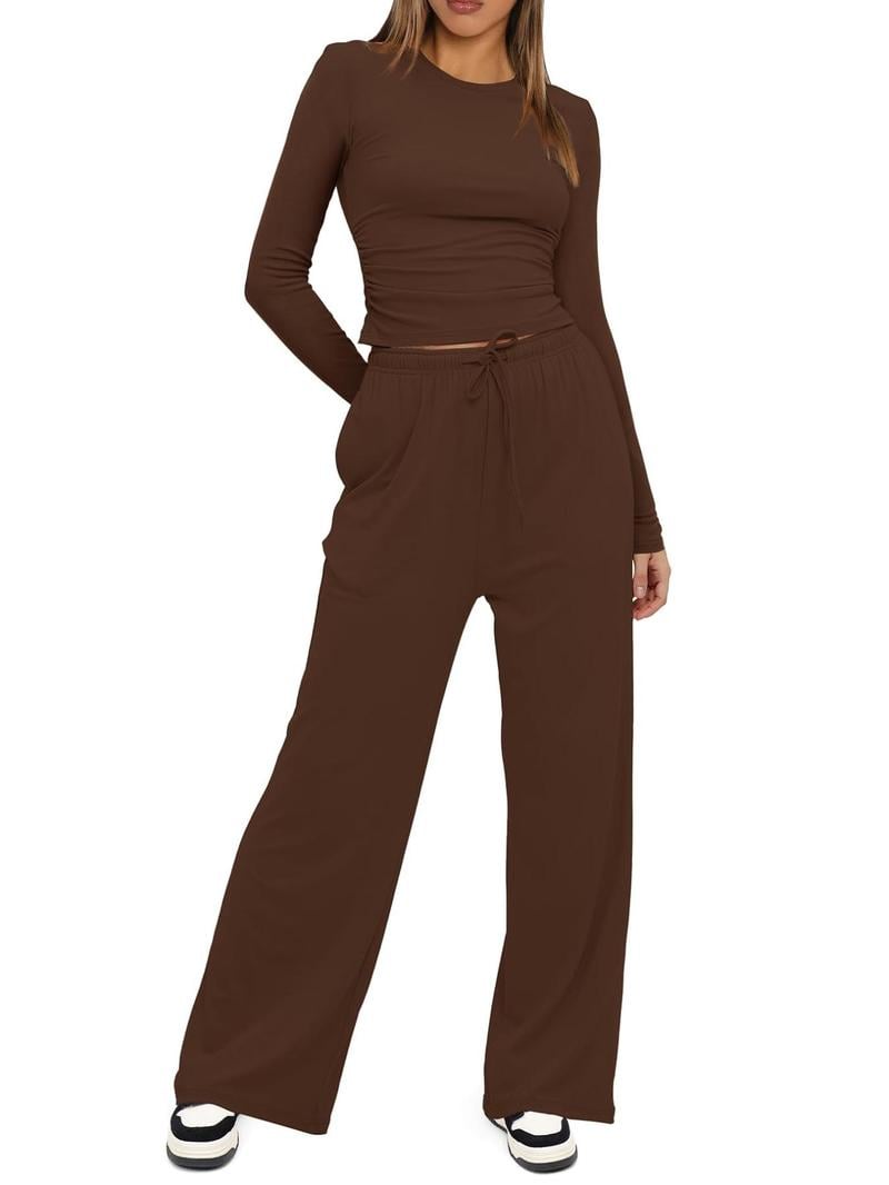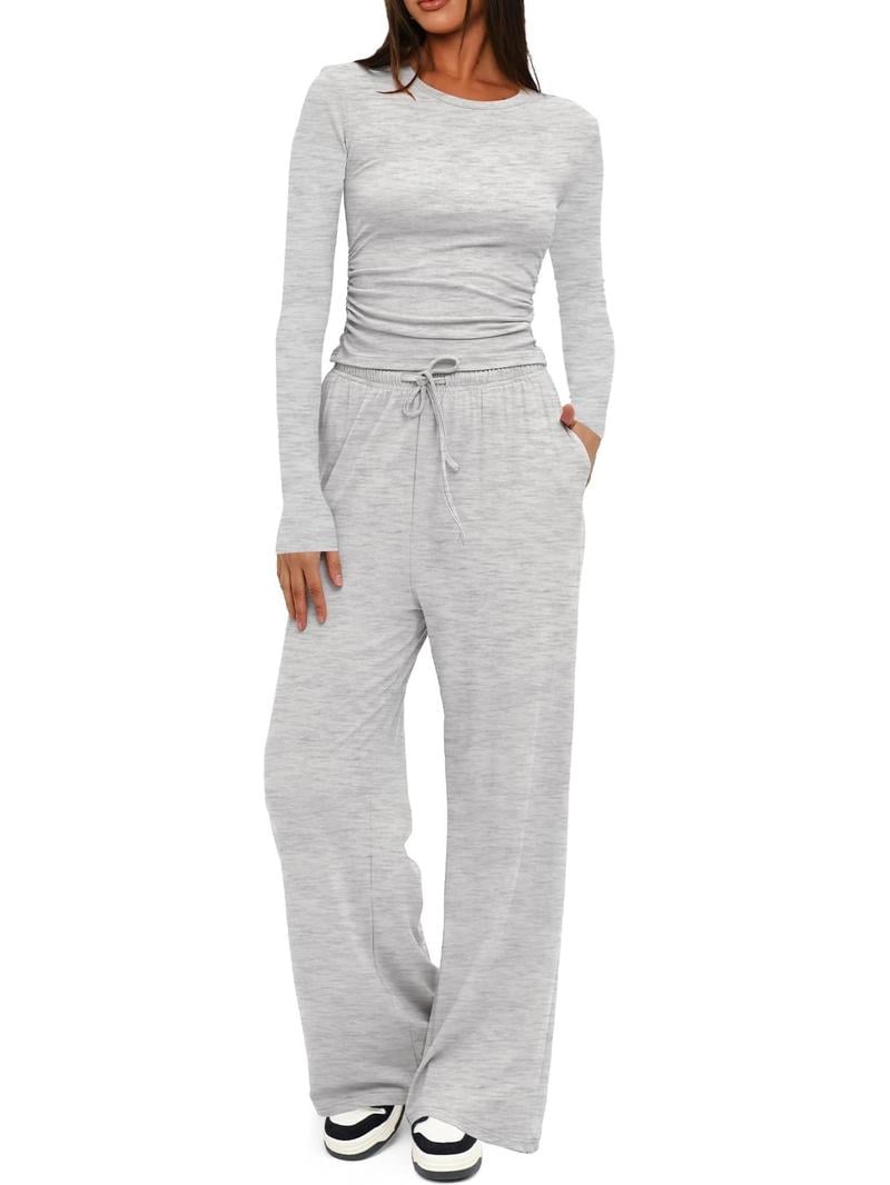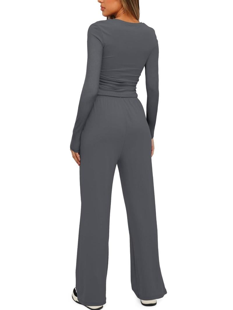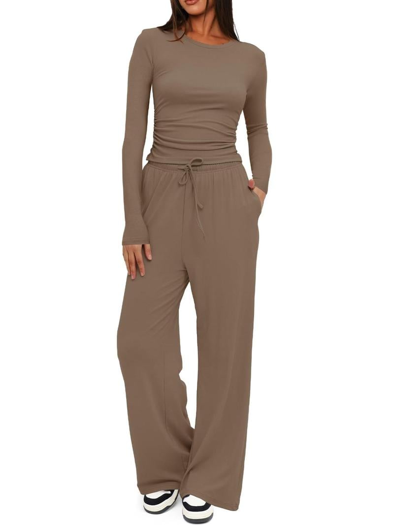 Two-piece Set Women's Solid Ruched Tee & Drawstring Pocket Pants Lounge Set, Casual Long Sleeve T-shirt & Elastic Waist Trousers, Ladies Sleepwear for All Seasons!
