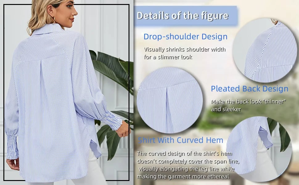Smocked Cuff Boyfriend Shirt: Casual Striped Shirts for Women with Pocket, Stylish V Neck, Striped Print, Smocked Long Sleeve Shirred Shirt, Summer Tunic Tops for women. Casual and creative design make you look stylish and charming.